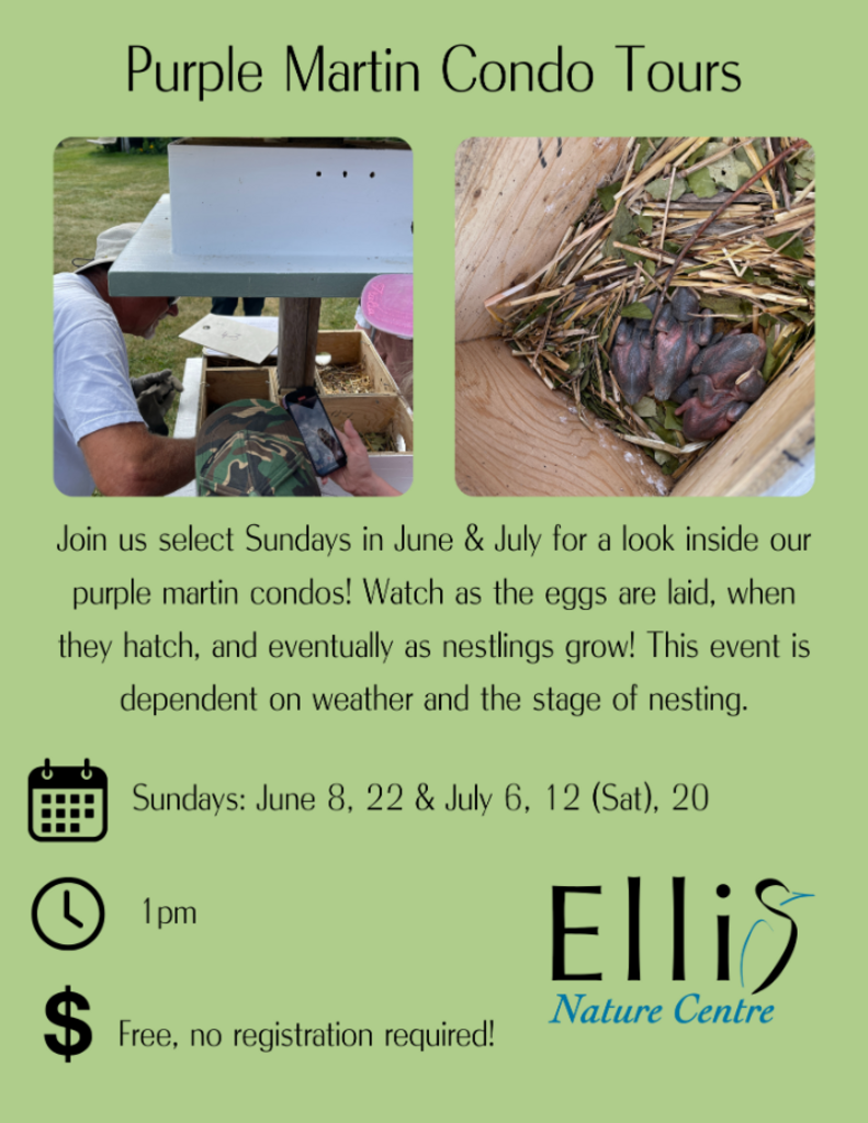Join our staff and purple martin experts for an inside look into the purple martin condos on our site! We’ll lower the condos so you can see how they’re laid out inside and the stages of the nesting process. These tours will be first come, first served and have no cost. They will also be dependent on weather and the nesting process, so keep an eye on our social media for the most current updates for these tours.