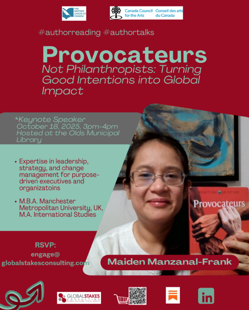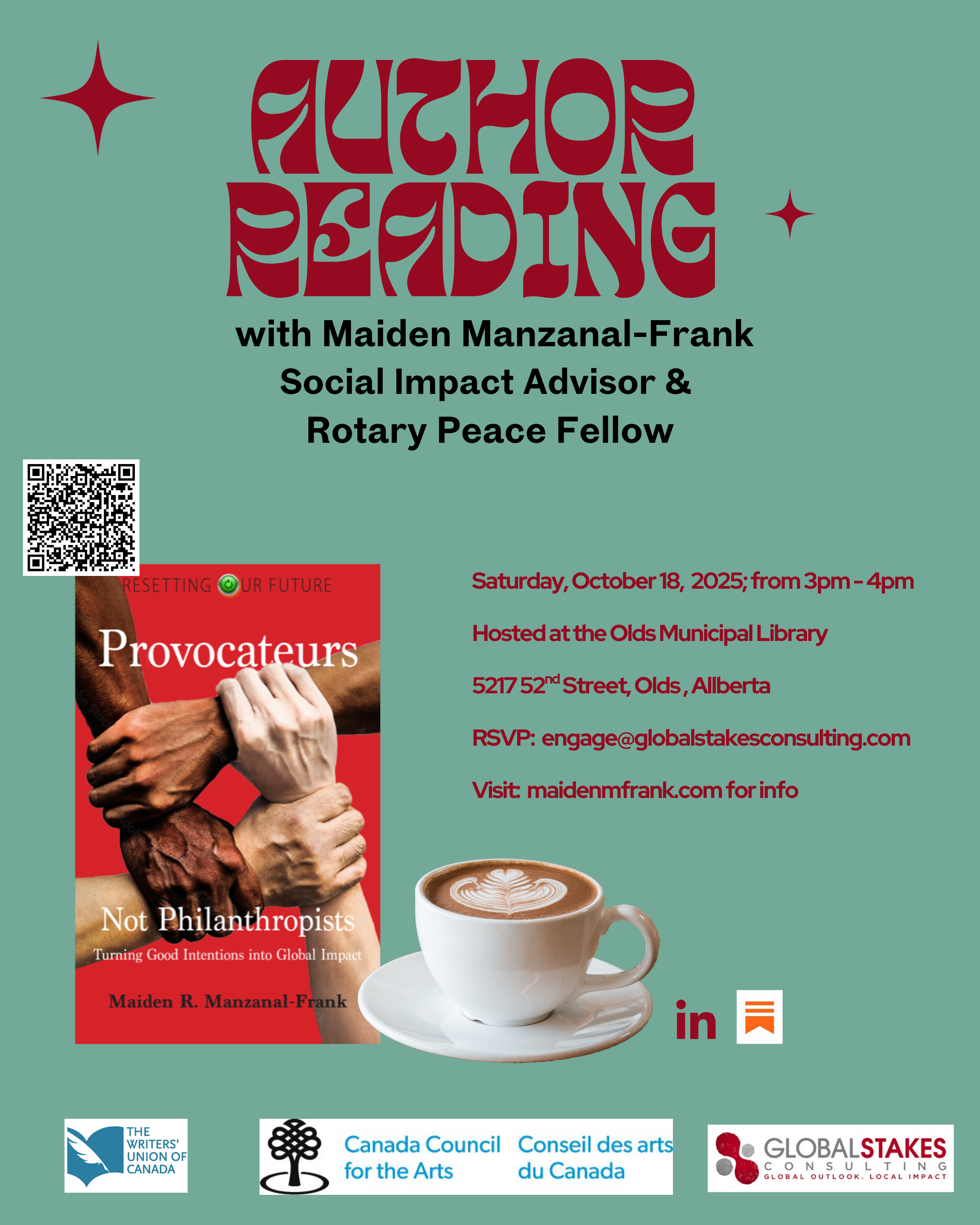 Maiden Manzanal-Frank, keynote speaker, author of the social impact book "Provocateurs" and a Rotary Peace Scholar in cooperation with the Olds Municipal Library is inviting book enthusiasts and social impact leaders in Central Alberta communities to join this free Author Presentation event on October 18th from 3pm to 4pm at the Olds Library.