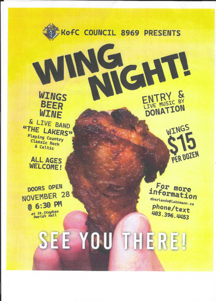 Join the Lacombe Knights of Columbus for a night of entertainment with live music by "The Lakers" and enjoy wings at $15 per dozen along with french fries at $8 per order. Beer and wine available for purchase.