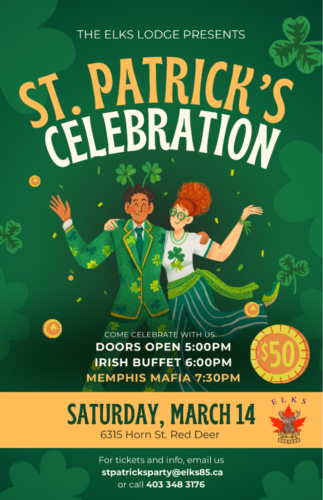 Red Deer Elks. St Patrick’s day party Doors open 5 pm Irish buffet 6 pm. Music by Memphis Mafia 7.30 pm Saturday. March 14 5 pm.