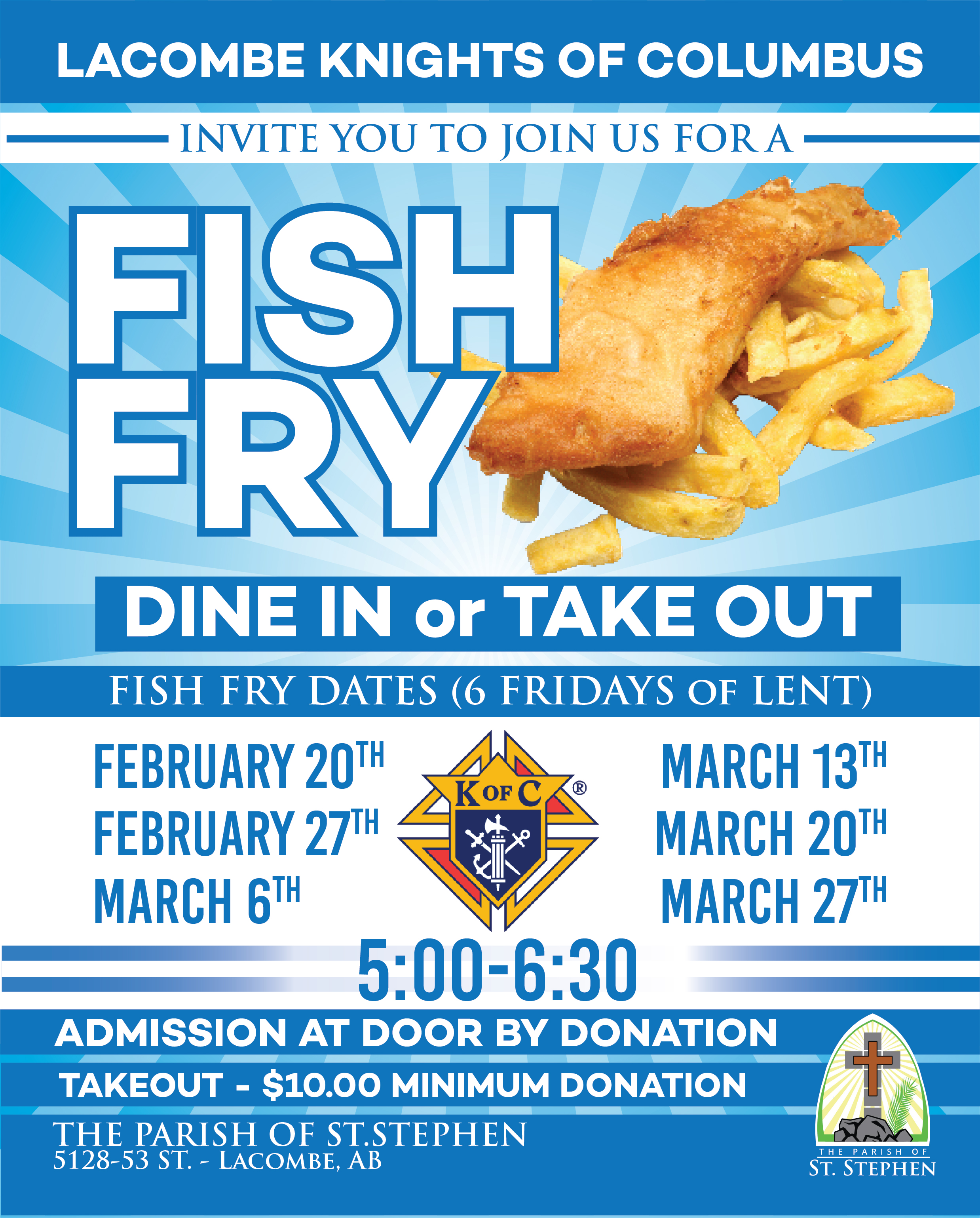 Join us for a Fish Fry Diner consisting of battered cod, fries, coleslaw, tea and coffee. < Cash bar also available.> Six Fridays of Lent from 5:00 P.M. to 6:30 P.M., admission is by donation. Please note that due to high volumes served, TAKEOUT has a minimum $10.00 charge.
