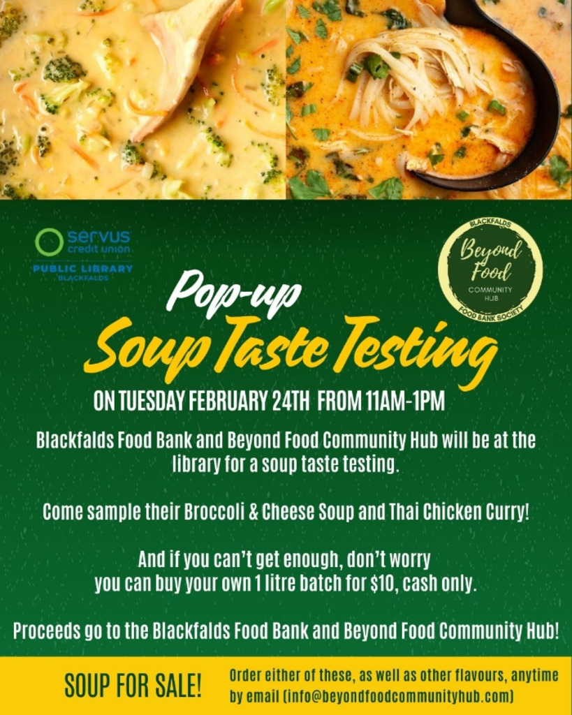 On Tuesday February 24th from 11am-1pm Blackfalds Food Bank and Beyond Food Community Hub will be at the library for a soup taste testing. πππ