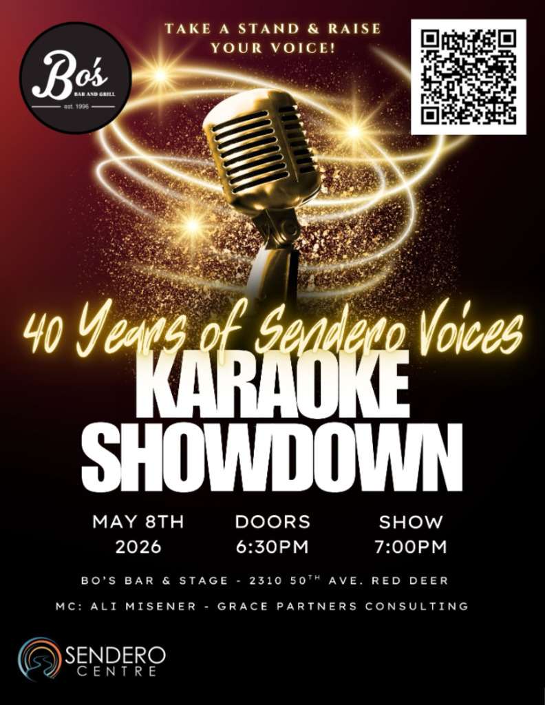 Karaoke Battle at Bo's Bar and Stage- 40 years of Sendero Voices. Celebrating the last 40 years of music and Sendero Centre's dedication to Central Alberta. Karaoke, Auction, Professional photos, 50/50 and more. Tickets at https://www.zeffy.com/en-CA/ticketing/40-years-of-sendero-voices-karaoke-battle