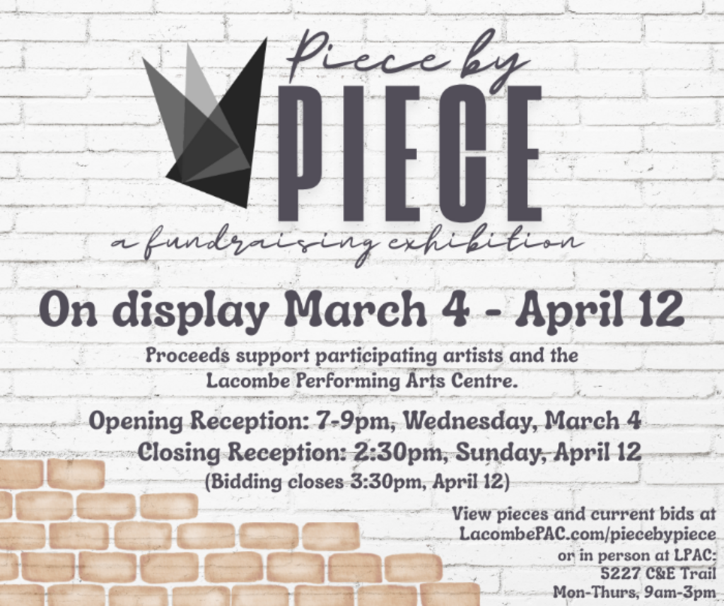 The 2026 Piece by Piece Fundraising Exhibition and Silent Auction runs March 4 - April 12, 2026. View the pieces in person at the Lacombe Performing Arts Centre on the gallery wall of the Lacombe Ford Lobby at LPAC (Mon-Thurs, 9am-3pm)!