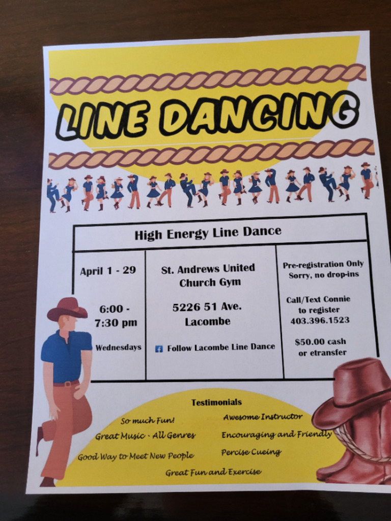 Line dance in Lacombe is offering an evening session Wednesdays April 1-29 from 6-730 at St Andrew's United Church gym 5226 51 Avenue Lacombe.