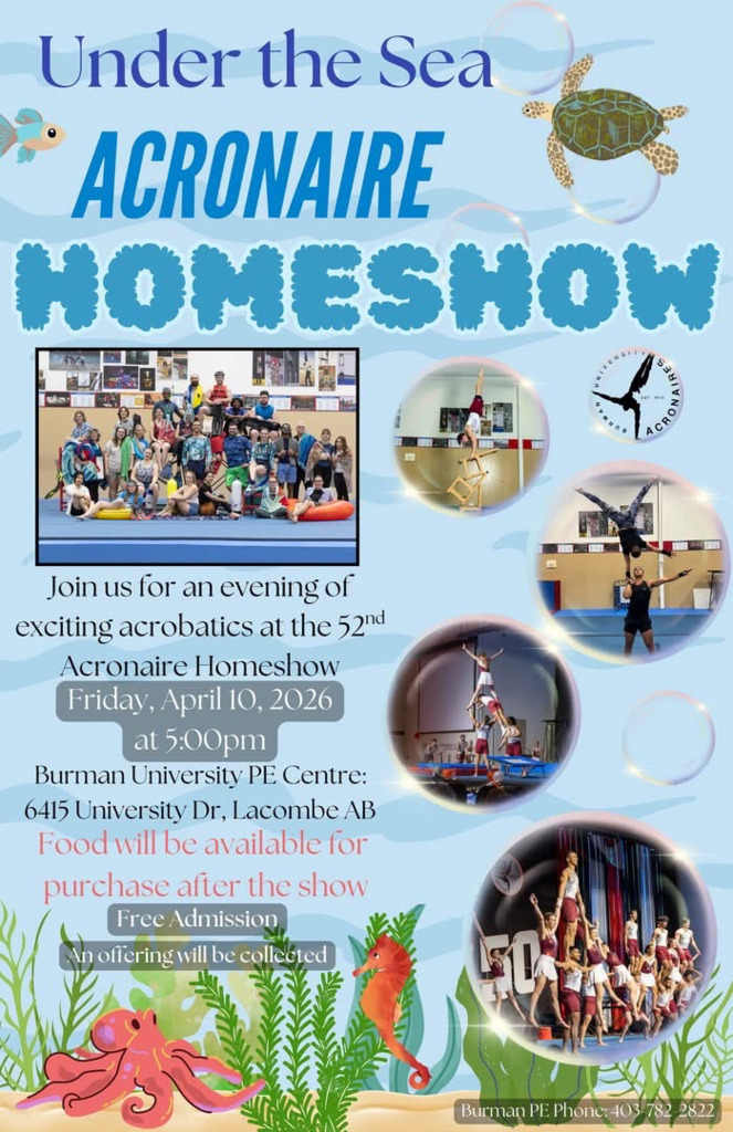 The Acronaires from Burman University would like to invite you to their 52nd annual "Homeshow"! It is an evening of fast paced fun with many different acrobatic and gymnastic type displays. This is an evening of entertainment for the entire family. There is no admission charge but an offering will be collected. The show will end around 6:30 pm at which time there will be food for purchase so you can have supper after the show! It will be an enjoyable evening!